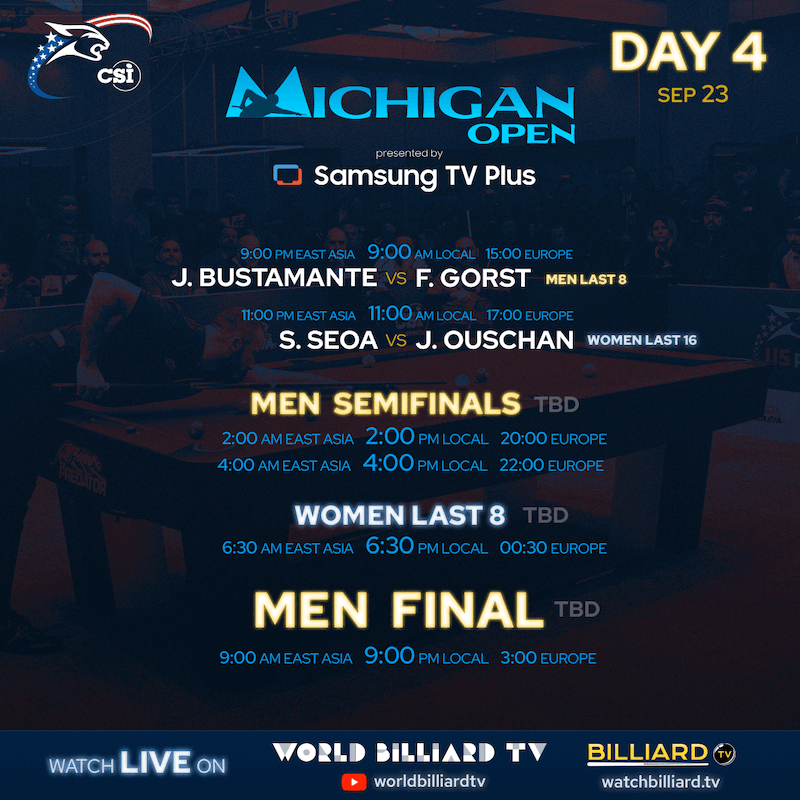 BATTLE CREEK, MI – The 2023 Michigan Open presented by Samsung TV Plus continued to deliver top-tier billiards action on its third day: