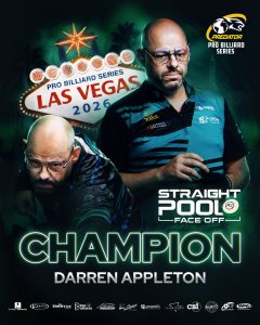 Legendary competitor Darren Appleton claimed victory in the Straight Pool Face-Off, highlighting experience and tactical mastery in one of the sport’s most demanding disciplines.